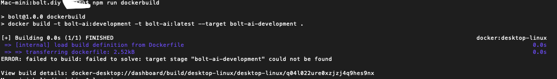 And running docker build directly also has the same error. The culprit seems to be in docker-compose.yaml which also references this non-existent target “bolt-ai-development”.